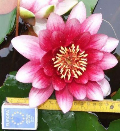 Nymphaea ‘Marliacea Rosea’ Niezawodna i sprawdzona odmiana’. Kwiaty bardzo duże do 20cm średnicy jasno różowe, kwitnienie: V-X, liście w początkowy okresie (V-VI) bordowe, później ciemno zielone, pokrywa około 1,5 m lustra wody.. Odmiana do średnich i dużych zbiorników. Głębokość sadzenia 50cm – 120cm stanowisko: słoneczne, półcieniste.