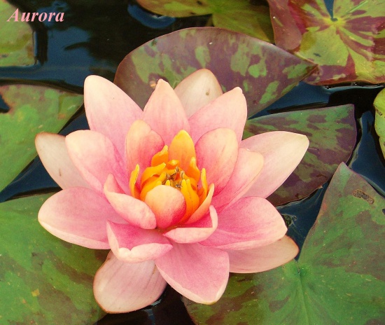 Nymphaea ‘Aurora’ - Piękna miniaturowa odmiana o brzoskwiniowych kwiatach i liściach z brązowym marmurkiem. Doskonała do oczka każdej wielkości. Głębokość sadzenia 30 – 60cm, stanowisko: słoneczne, półcieniste, powierzchnia wody pokryta liśćmi: do 1m², kwitnienie: V-IX. Piękna, niewielka odmiana doskonale nadająca się nawet do niewielkiego oczka. Należy do grupy lilii o zmiennej barwie ( pomarańczowy, brzoskwiniowy, łososiowy).